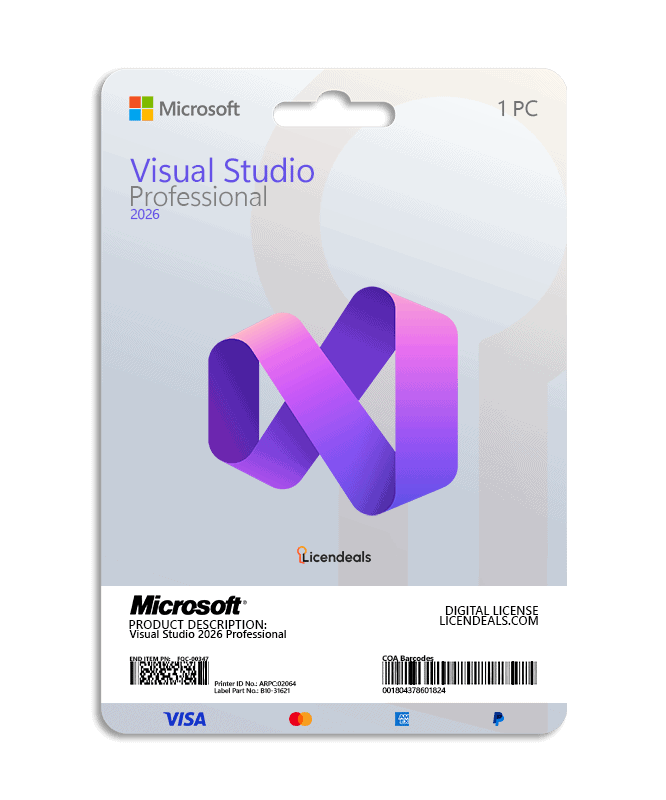 This license allows you to activate Visual Studio 2026 Professional on your PC. Buy now and we’ll instantly send your Visual Studio 2026 Professional product key to your email. This is a one-time license and the activation key is only valid for installation on 1 PC. This license can only be used once to activate Visual Studio 2026 Pro.