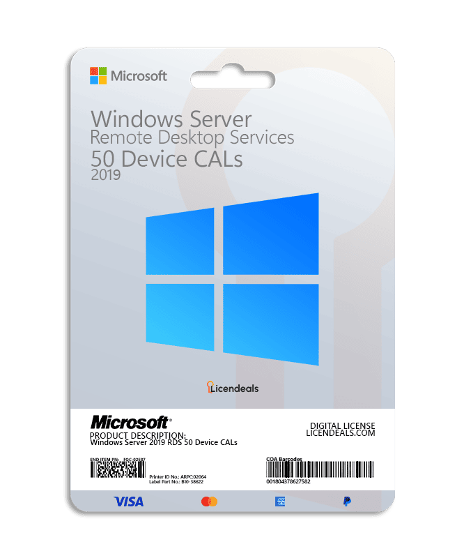 Buy Microsoft Windows Server 2019 RDS 50 Device CALs activation key at the best price at Licendeals. Order now and we will send you the Windows Server 2019 RDS 50 Device CALs, downloadable software and purchase invoice directly via email. This is a one-time license and the activation key is only valid for installation on 1 admin user – 1 server.